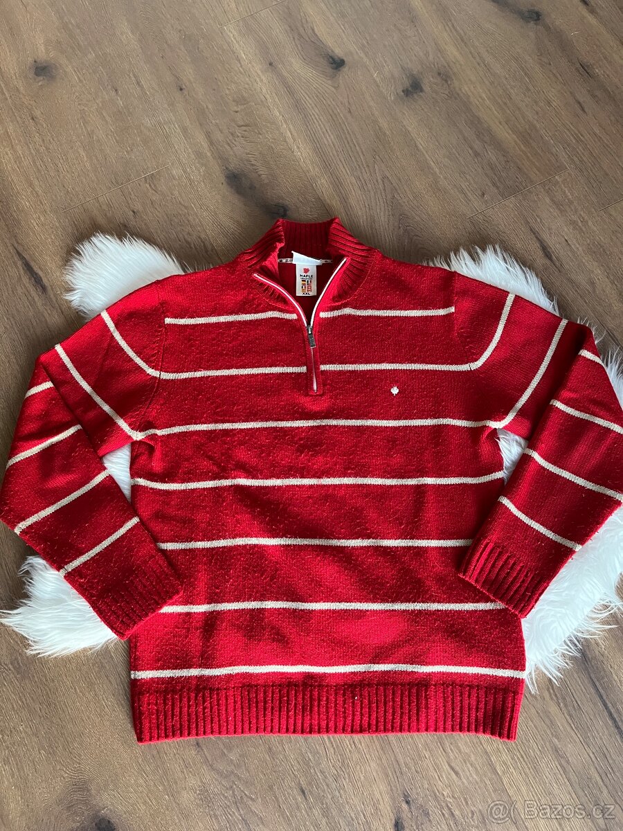 Hezky svetr se stojackem, na zip, cerveny s pruhy,