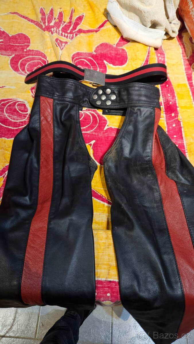 Prodám dlouhé kožené kalhoty- chapsy z jemné kůže jehnětina s červeným dekorema kožený opasek ve stejných barvách. Pro štíhlé postavy pas 70-80 cm