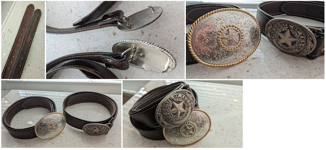 Nabízím dva westernové opasky. Kdysi jsem si je nechal udělat u sedláře Zajace v Rožnově p.R. Ten menší můj synek párkrát vzal, ten můj je skoro jako nový. Větší přezka je 9x7 cm, postříbřená a pozlacená. Pásek má 107 cm. Menší pak 6,5 x 5 cm a délka pásku je 74 cm. Šířka je stejná a to kolem 37 mm. Cenu bych si představoval 1300 za větší a 500 za menší. Pokud někdo vezme oba, jistě se domluvíme. Možnost předat na ose Kunčice - FM - OV nebo poštou.