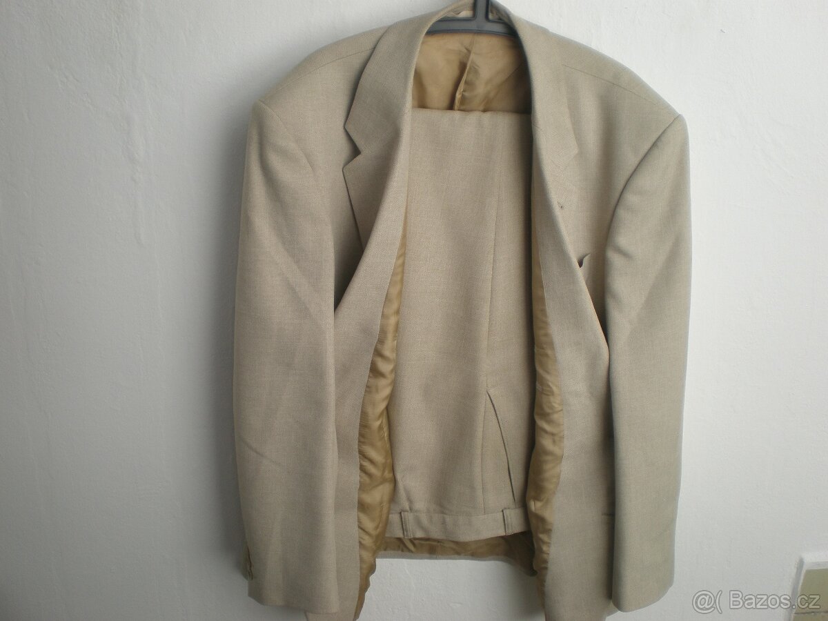 Prodám nebo vyměním za potřebné. Kónig světlý v barvě bílé kávy, luxus jeden den nošený (svatba), krásný stav, bez vad. Pořizovací cena 5.700 Kč, současný stav nového. KALHOTY - délka 110 cm, pas 106 cm rezerva v klínu, rozkrok 35 cm, boky 138 cm, spodní šíře nohavice 24 cm, 3x kapsa. SAKO délka od ramen 73 cm, hrudník 125 cm, pas 120 cm, rukáv od spodního švu 43 cm. 2 zapínací knoflíky, 2 kapsy, 1 náprsní kapsička, 2 vnitřní kapsy. Při koupi dvou položek z mé nabídky získáte na tu dražší 10% slevu.