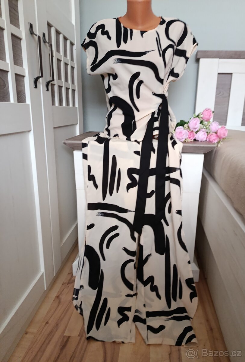 Krásný letní komplet :-) Halenka je s úvazem a kalhoty jsou rovného volného střihu po stranách s rozparky....Komplet je v perfektním stavu, bez vad...Míry : halenka - délka 58 cm, pas 2 x 53 cm, průramky 2 x 56 cm, kalhoty - délka 102 cm, pas 2 x 36 cm. Na boku mají zip. Materiál : 100 % polyester. Poštovné - balíkovna za 85 Kč nebo zásilkovnou za 90 Kč. Velikost M.