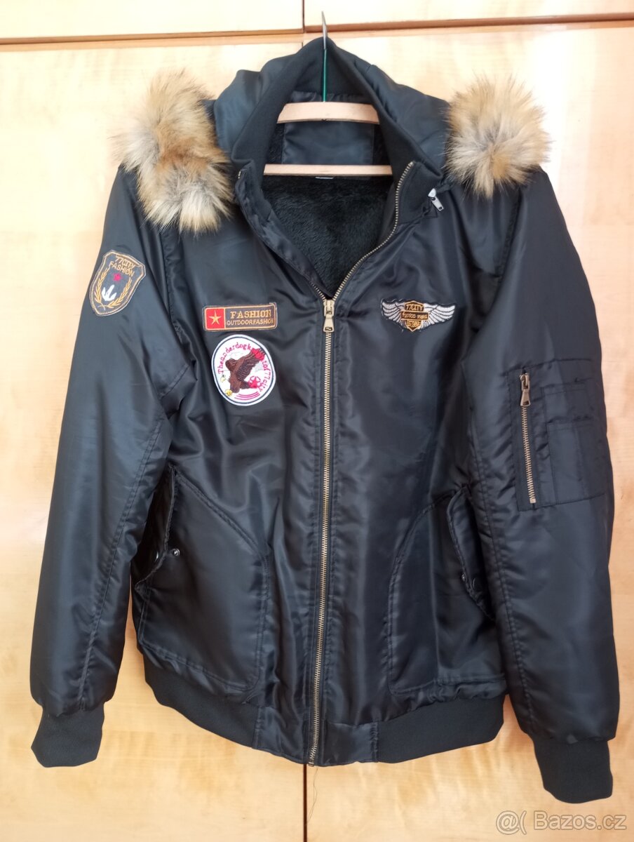 Pánská (chlapecká) bunda, černa s pevnou vložkou, odepínací kapuce, délka 72 cm, šířka v ramenou 52 cm, délka rukávu do manžety 68 cm.neposkozena.