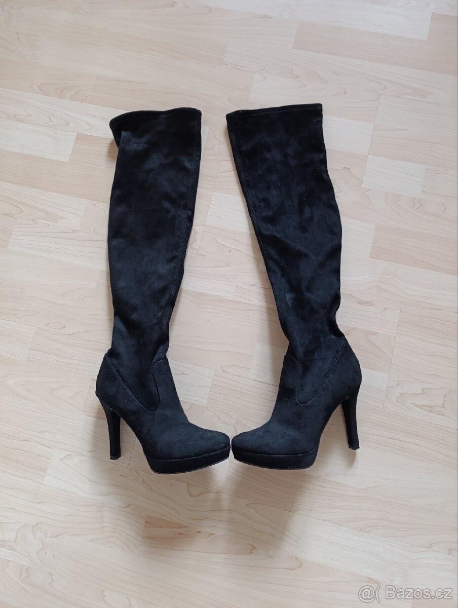 Krásné černé elegantní semišové kozačky nad kolena, velikost 38, podpatek 11 cm, horní obvod 18 cm, pružný, zip, 1x nošené, jako nové, prodávám z důvodu špatně zvolené velikosti