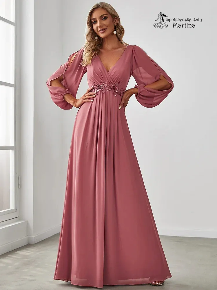 Nádherné lososové šaty s véčkovým výstřihem a prostřihy na rukávech, v pase zdobené flitry. Vel. Odpovídá L až M (prsa 46 až 50 cm, pas 40 až 41 cm). Dělají krásnou postavu. Nové s visačkou.