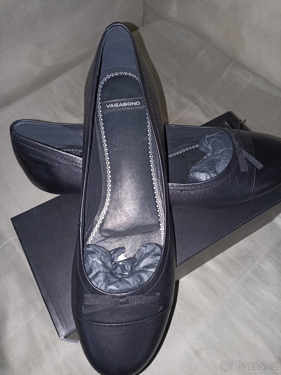 Černé kožené baleríny Vagabond vel.42/stélka 27cm, s koženou stélkou, ozdobnou mašlí a nízkým podpadkem. Dvakrát obuté, špatně zvolená velikost. Jsou NOVÉ a jen mi leží ve skříni. PC kolo 2500,- Kč. Možný osobní odběr v Praze a v Příbrami jinak poštou jako cenný balík za 119,-Kč.