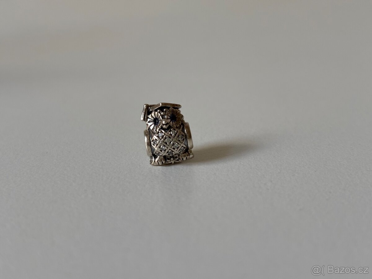 Nošený, ale nepoškozený přívěšek ve tvaru sovy značky Pandora.