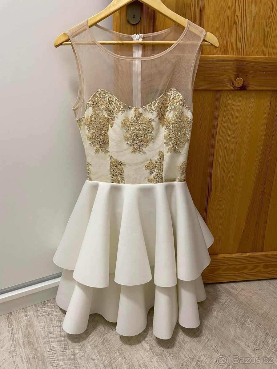 Krásné bílo zlaté šaty do tanečních, na sobě 4x, top stav, šaty jsou slušivé a elegantní. Velikost 36, kupováno v Max Tara, PC 3500,-