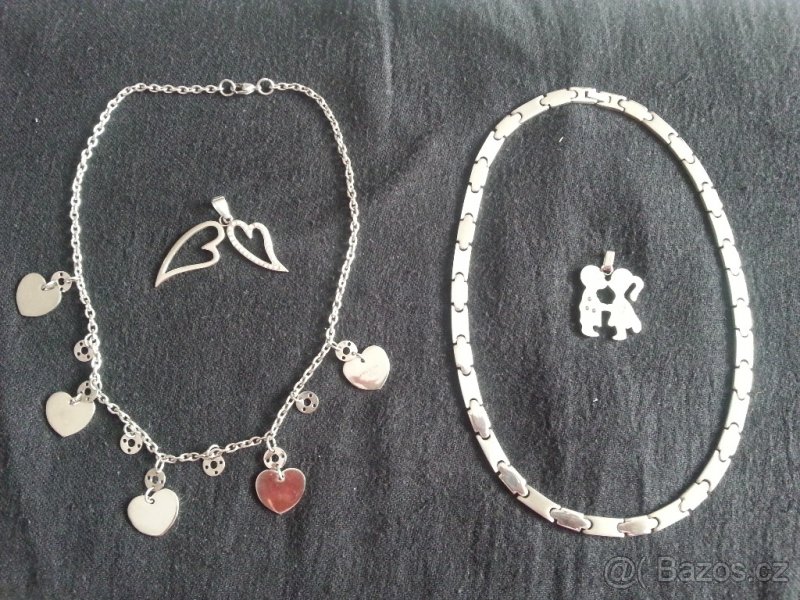 Prodám různé šperky z chirurg.oceli a stříbra, viz FOTO. Náhrdelník se srdíčky, délka 45 cm, srdce-š1,8 – v1,5cm, PC 1500,-/nyní za 290,-. Náhrdelník z políček na 1.fotce je prodaný!!! Přívěsky: masivní holka+kluk se zirkony (š2,5-v3cm, za 99,-).Vše NOVÉ, nenošené. Osobní odběr v Praze nebo zaslání poštou.Platba předem převodem na můj účet vč. ceny za poštovné dle sazebníku pošty. Prohlédněte si další moje nabídky, při objednávce více ks hradíte jen jedno poštovné.