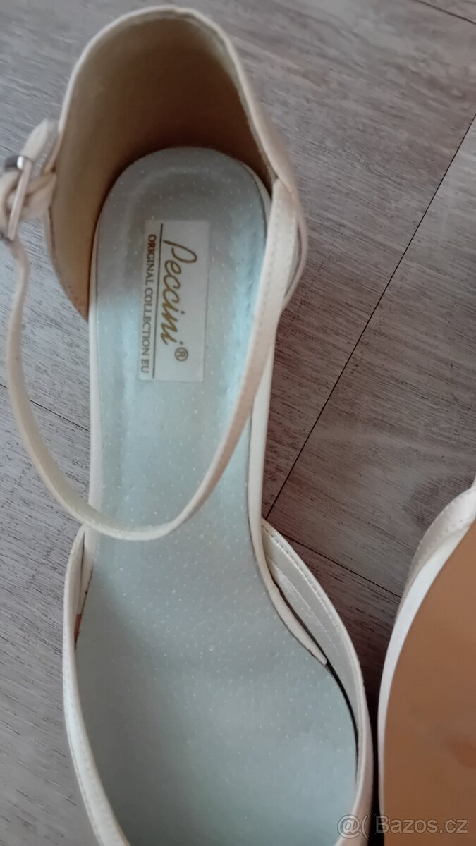 Svatební společenské střevíčky kožené,vršek satén barva euru.velikost40.jednou nošené.