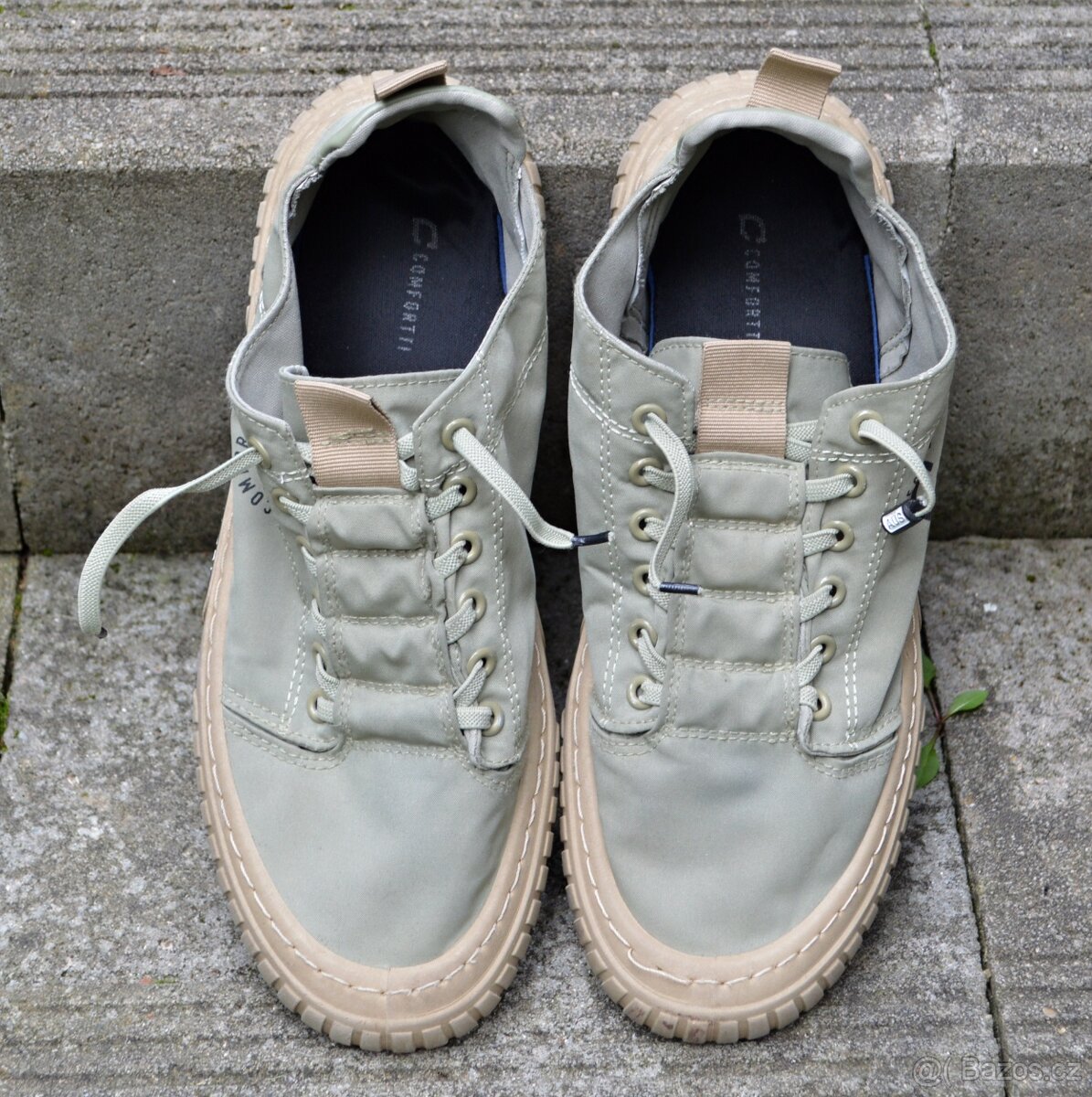 Prodám plátěné zelenošedé (khaki) tenisky vel 42, délka vnitřní stélky 27 cm, unisex, ale spíše chlapecké. Jsou lehoučké, měkké, s gumovou podrážkou.
