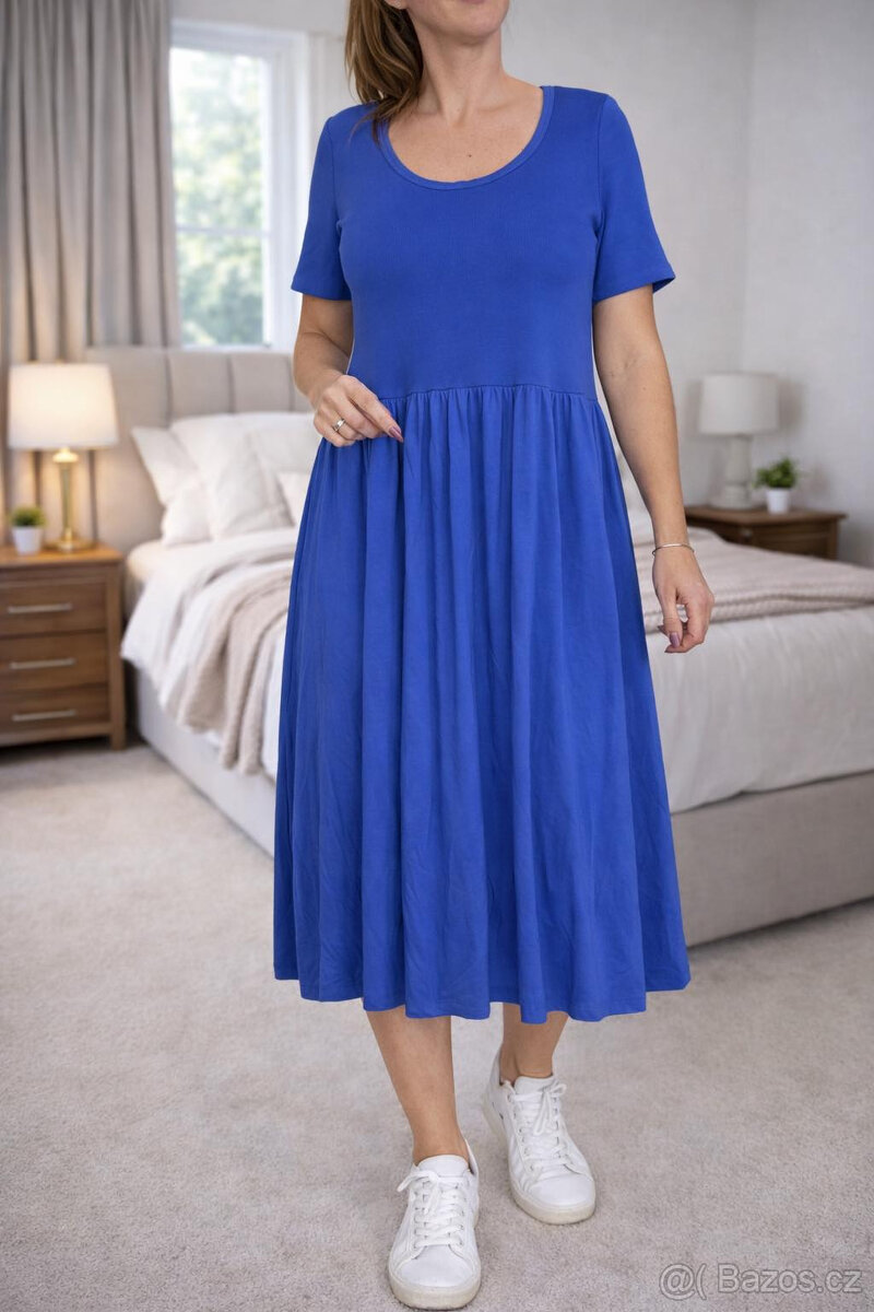 Dámské šaty midi plisované modré Numoco XL 42 - [6.1. 2026]Prodám dámské šaty zn. Numoco, vel. XL, nové, jen odstřižená cedulka. Barva královsky modrá. Plisovaná sukně a volánky, zavinovací výstřih, podšívka, pod prsama/v pase guma, na zádech zip. Rozměry: mezi podpažími cca 47 cm v klidu (natáhne se na cca ...