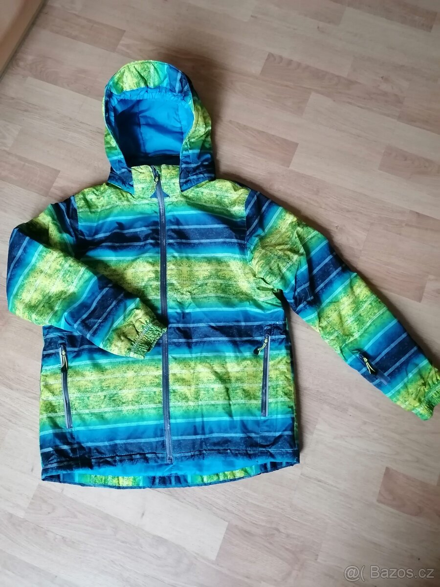 Krásná nepromokavá bunda v perfektním stavu - viz detaily. Nošená synem krátce na střídačku s dalšími. Velikost 146/152,odepínací kapuce, 2 zipové kapsy + 1 na rukávu a 1 uvnitř. Sněhový pás, dvojité konce rukávů s otvorem pro palec, fleece okolo krku, reflexní odrazky ze všech stran. Délka 60 cm+ 2 cm zadní díl, rukáv od kapuce 66 cm+ 5 cm vnitřní rukáv. Mohu poslat do zásilkovny za 89 kč, nebo balíkovny za 50 kč
