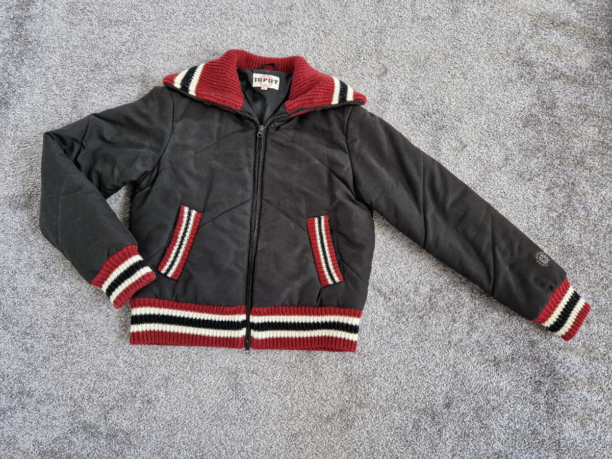 černá bunda s pletenými prvky na rukávech, kapsách, kolem krku a kolem pasu