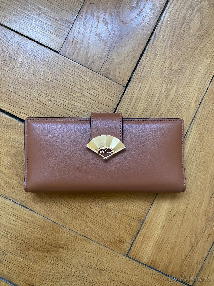 kožená peněženka s elegantním zapínáním na klopu, kterou zdobí výrazný vějíř Karl Signature ve zlaté barvě