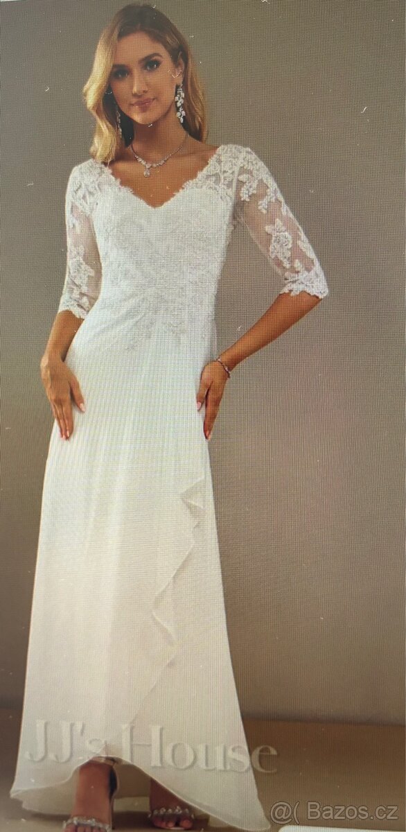 Krásné svatební šaty v kombinaci s krajkou a měkkým šifonem a výstřihem do V. Míry: přes prsa 88 cm, pas 79 cm, boky 93 cm. Krajka je pevná, nepruží. Délka šatů je od krčního důlku na zem 145 cm. Obal i boty vel.39 v ceně.