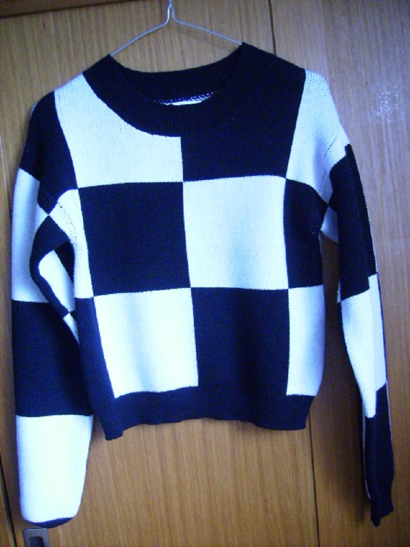 Nový, nenošený dámský svetřík vzor černobílé velké kostky, hodně pružný ( vel. uvedena XS, obleču v pohodě na M ), délka 51 cm, šířka v průramcích v klidu 44 cm - hodně pruží !