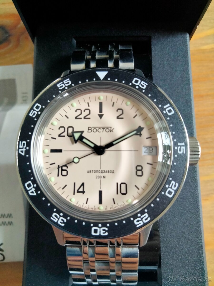 Prodám hodinky Vostok s krabičkou a návodem. Automatický nátah. 24 hodinový ciferník. Plně funkční. Perfektní stav!