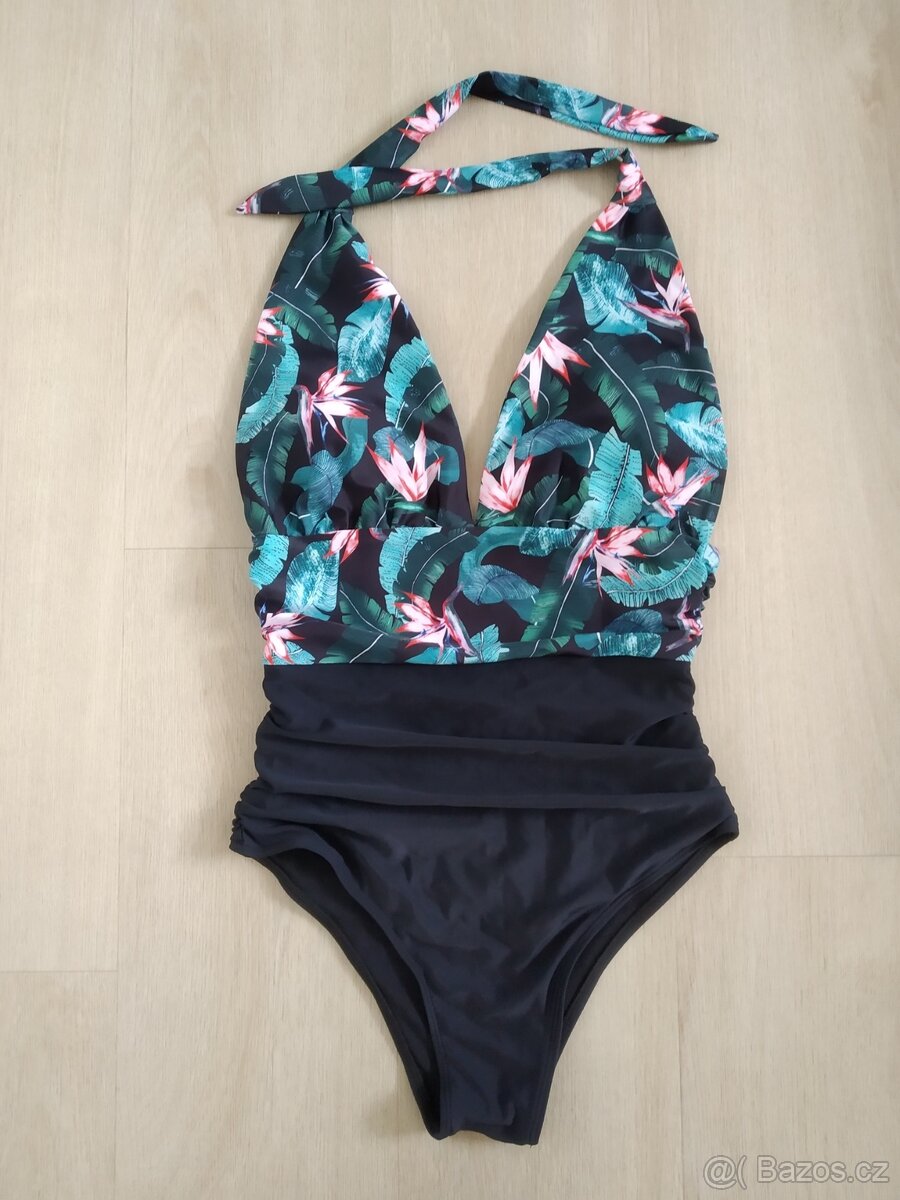 Prodám dámské jednodílné plavky vel. uvedena S. Zavazování za krkem, v prsou mají vycpávky, které lze i vyndat. Nošené celkem málo, jsou stále pěkné, v dobrém stavu, bez vad.