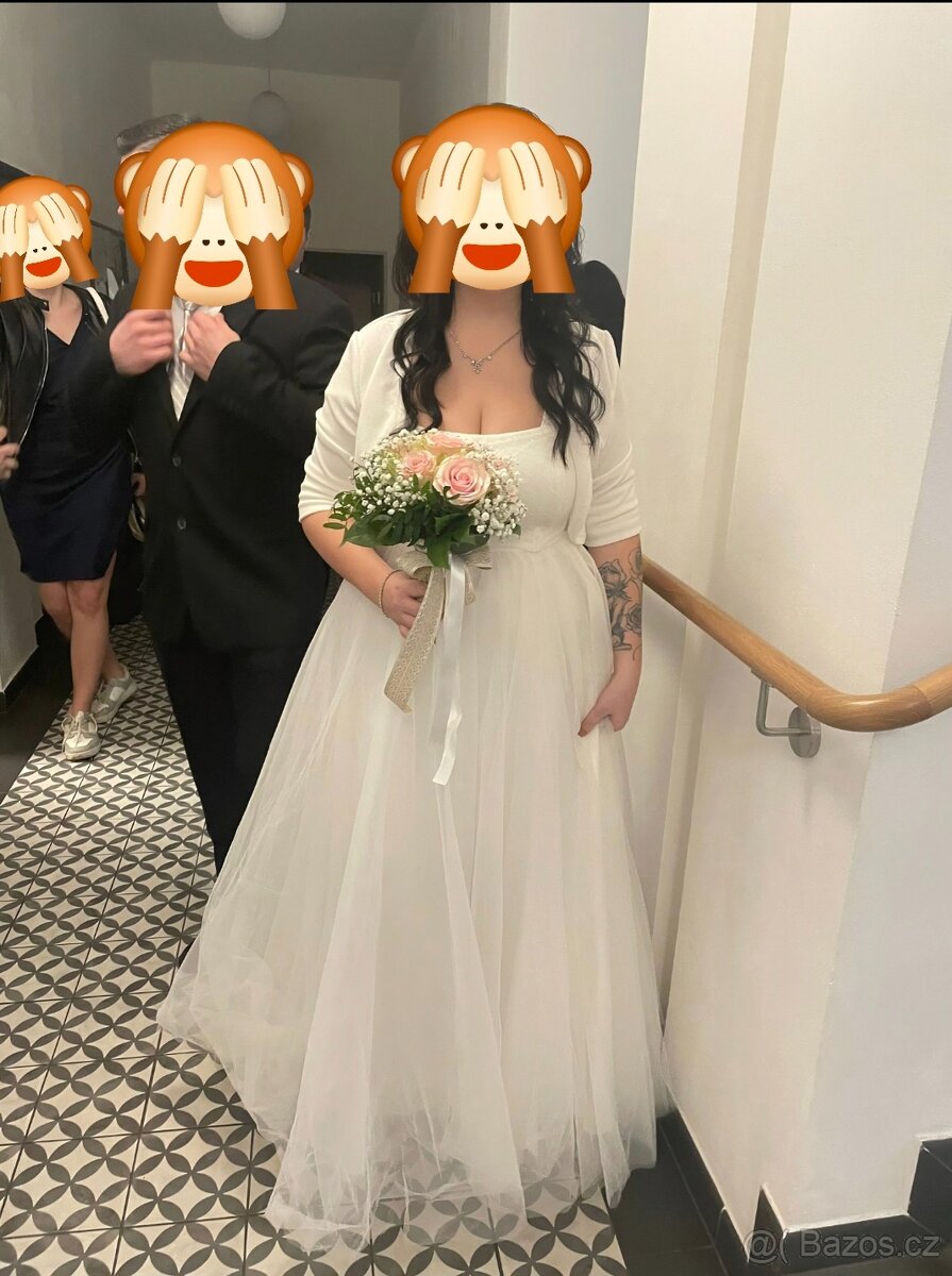 K šatům přidám nový, nevyužitý závoj a mohu přidat i boty bez podpatku, které sem měla na noze asi 20 minut. Popřípadě mohu přidat i zapichy do vlasů, nepoužité