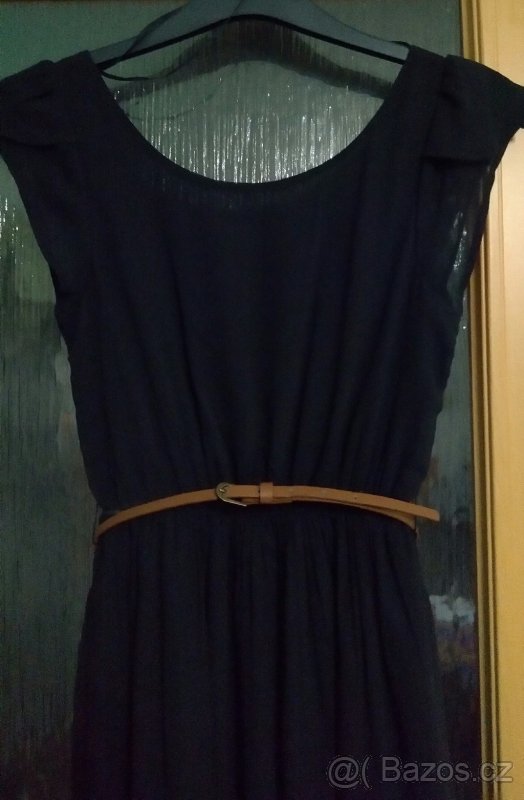 Krásné černé splývavé šaty, vel. 34. V pase guma a tenký hnědý pásek, krátké volánkové rukávy, délka 93 cm.