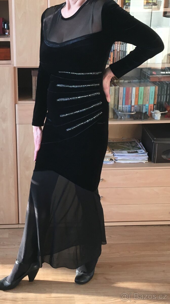 Krásné večerní společenské/plesové šaty originálního střihu. Materiál: kombinace černého elastického sametu a černého tylu, v oblasti boků je ozdobná aplikace třpytivých stříbrno-bílých kamínků. Spodní část z mírně průhledného tylu vytváří efektní zvlnění. Pod černým tylem je lehce vidět silueta nohou. Zapínání výstřihu vzadu je za krkem na knoflíček. Šaty jsou velmi efektní, přitom decentní. Díky elastičnosti sametu se šaty zcela přizpůsobí liniím těla.