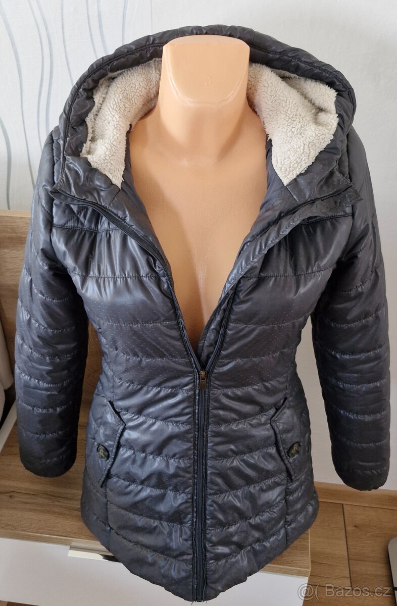Zateplená šedá prošívaná bunda, mírně vypasovaná, uvnitř vyteplená fleecem,š.pod rukávy 48 ,pas š.43, spodní lem 55 cm, rukáv od krku 72 cm.