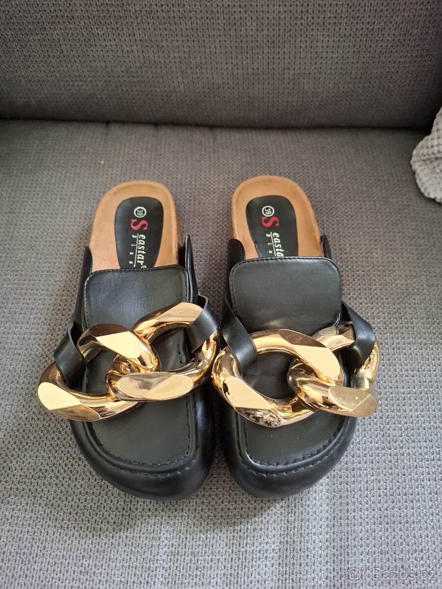 Pohodlné elegantní černé pantofle se zlatým řetězem, vel. 38