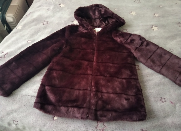 Moc krásný nový kožíškový kabátek s kapucí. Délka 67cm, šíře 52cm, rukáv od krku 67cm. Barva tmavá vínová.