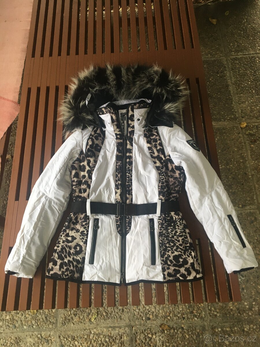 Odepínací kapuce (na zip), pravá kožešina z mývala také odepínací (na druky). Dvě přední kapsy na zip, kapsa na skipas na rukávu. Uvnitř náprsní kapsa na brýle s přihrádkou na telefon, na druhé straně náprsní kapsa na zip. V pase černý pásek na přezku, kamínkové logo na rukávu.