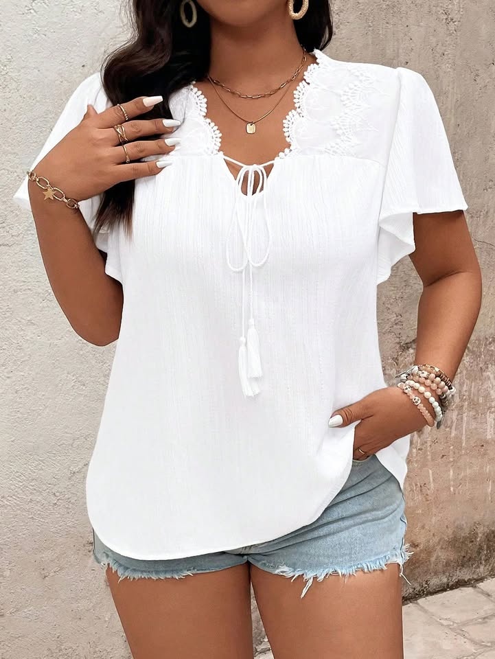 Nová, romantická halenka s krajkou a vázáním, materiál žerzej, rozměry prsa 115-125 cm, boky 120-130 cm, délka 70 cm