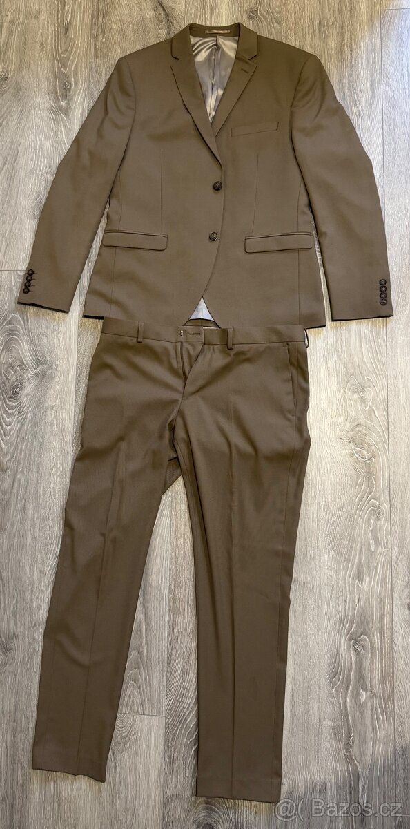 Prodám 1 vyzkoušený pánský oblek zn. Isaac Dewhirst. Jako nový. Rozměry ve fotkách. Barva zlatá (světle hnědá). PC 2200,-
