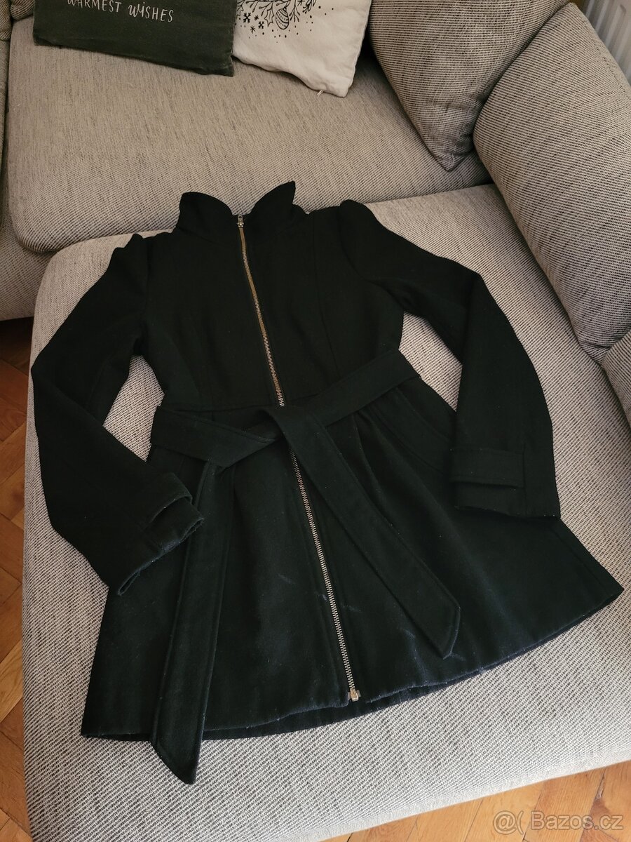 Prodám dámský přechodový kabát zn. H&M, vel. XS. Nošený, ve velmi dobrém stavu, pouze místy drobný žmolek. Barva černá, zapínání na kovový zip, límec stojáček, lehce nabíraná ramínka, s opaskem, 2 přední kapsy, střih do A, lesklá podšívka, ozdobné pásky na koncích rukávů. Vhodný na jaro a podzim jako přechodový kabát. Materiál: 60% vlna, 35% polyester, 5% jiná vlákna; podšívka 100% polyester.