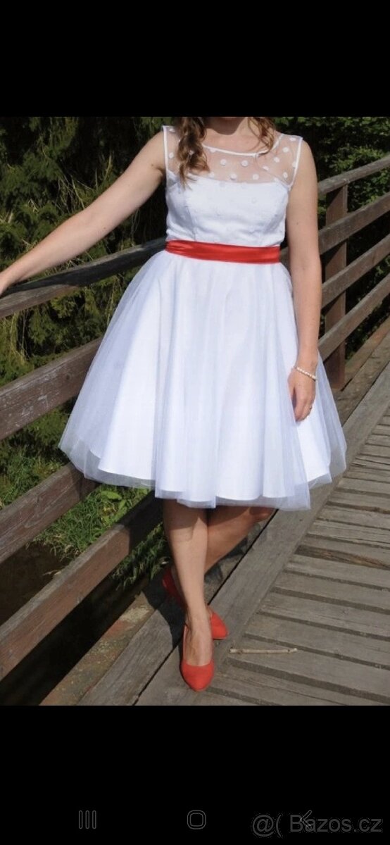 Svatební šaty šité v salonu Mia Bella, ve stylu padesátých let. Slušivé a pohodlné, vydržíte v nich až do rána. Živůtek s puntíky a tylová sukně. Barva stuhy červená, ale tylová sukénka a tím i barva stuhy lze samozřejmě vyměnit. Včetně spodničky.