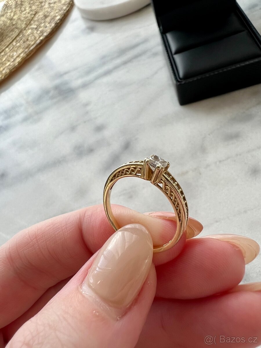 Nabízím k prodeji unikátní prsten ze 14 Kt zlata s centrálním diamantem čistoty VS1 barvy G a postranními diamanty stejných parametrů. Exkluzivní brus princess, který centrálnímu diamantu dodává ohnivý lesk.
