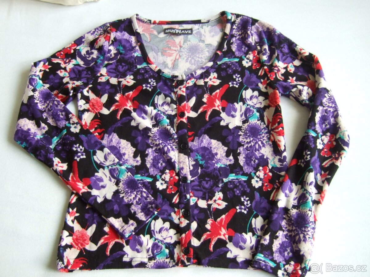 Svetr na knoflíky. Vel. L. Značka MustHave. Šířka 48 cm a délka 57 cm. V barvách fialových. Je to slabší pletenina. Nový, jen vypraný.