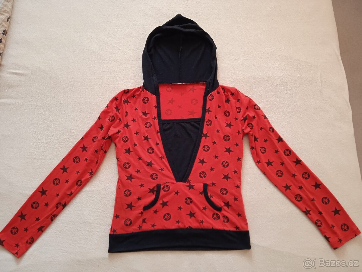 Prodám zánovní dámské triko HG FASHION s kapucí, 96% viskóza, 4% elastan. Přední délka od okraje výstřihu 40cm, zadní 55cm, obvod přes prsa 88cm, boky 86cm.