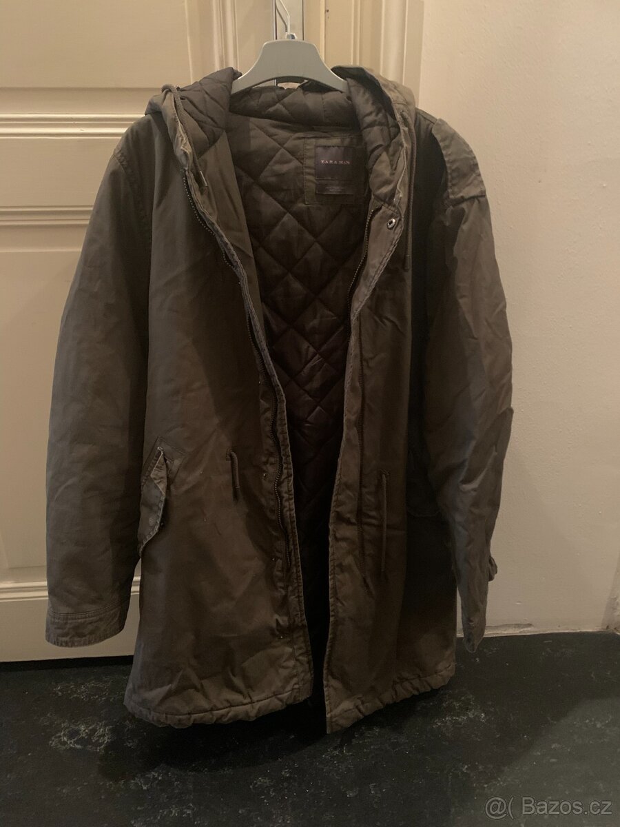 bunda pánská zelená, delší, parka, nenošená, vel.M, s kapucou, vevnitř prošívaná
