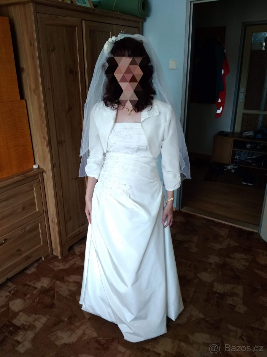 Prodám tyto krásné svatební šaty. Šaty byly kupované ve svatebním salónu, jejich původní cena byla 10000 kč, nyní je nabízím za cenu 3000 kč. Šaty jsou smetanové barvy, bez ramínek, vzadu na zip a šněrování, kterým lze šaty stáhnout nebo povolit podle dané postavy. V přední části je látka ozdobně naskládaná a zdobená výšivkou. Jsou upravené na výšku 160 cm, dole jsou zahnuté, dají se tedy povolit až na postavu výšky 175 cm. Součástí šatů je i bolerko, také zdobené výšivkou, závoj a umělá kytička do vlasů. Případně mohu přidat i bílé svatební boty na mírném podpatku.