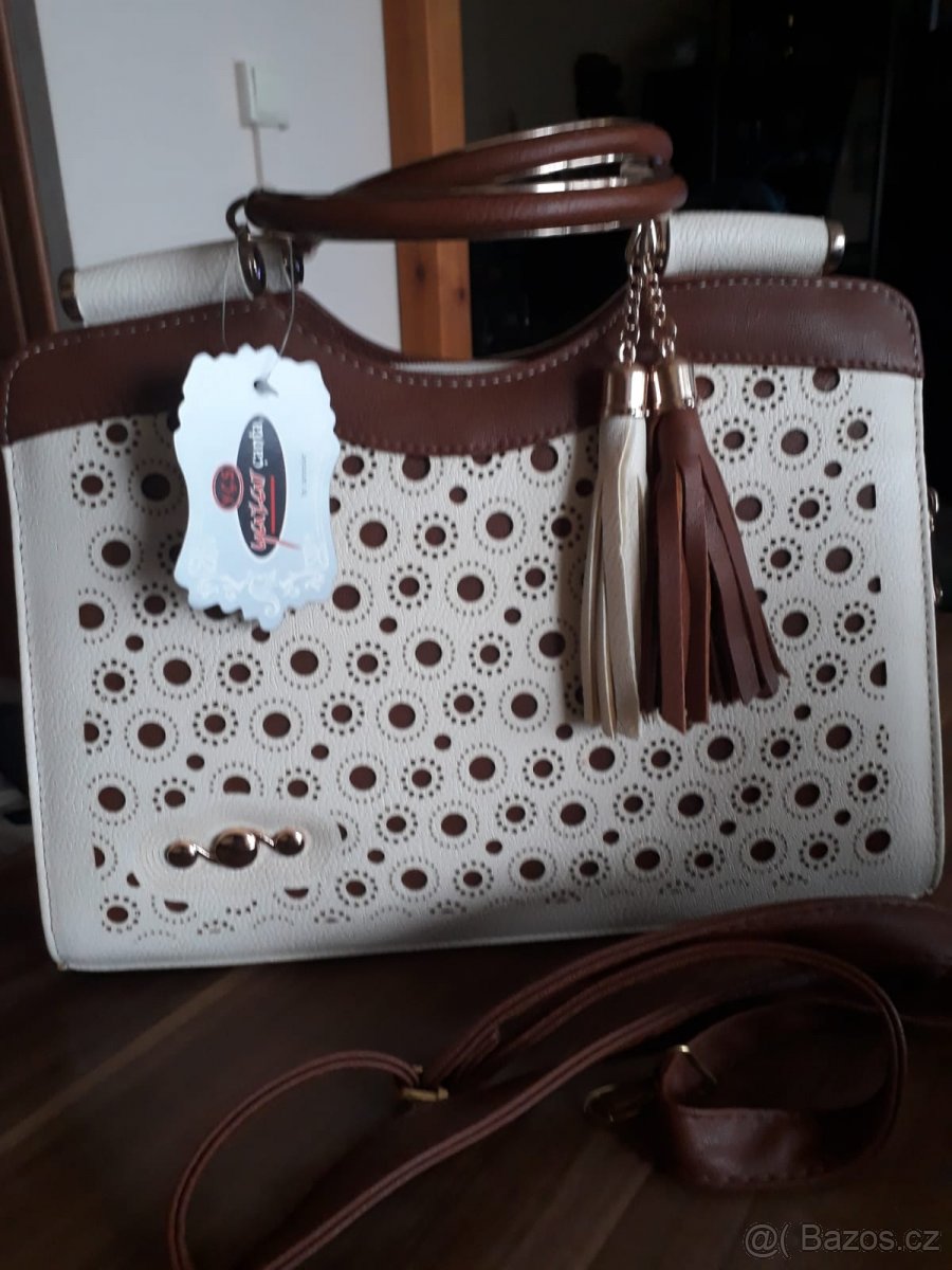 Úplně nová kabelka ještě s visačkou ve hnědo-smetanové barvě, se zlatavým zdobením, krátké i dlouhé držení, na zip, uvnitř další kapsička na zip. Původní cena přes tisíc Kč. Rozměry na výšku 24 cm (bez držadel) a šířka 32 cm. Hluboká je 20 cm. Uvnitř uprostřed ještě jedna přihrádka na zip. Kupováno v YAZAR CANTA by Zerenler