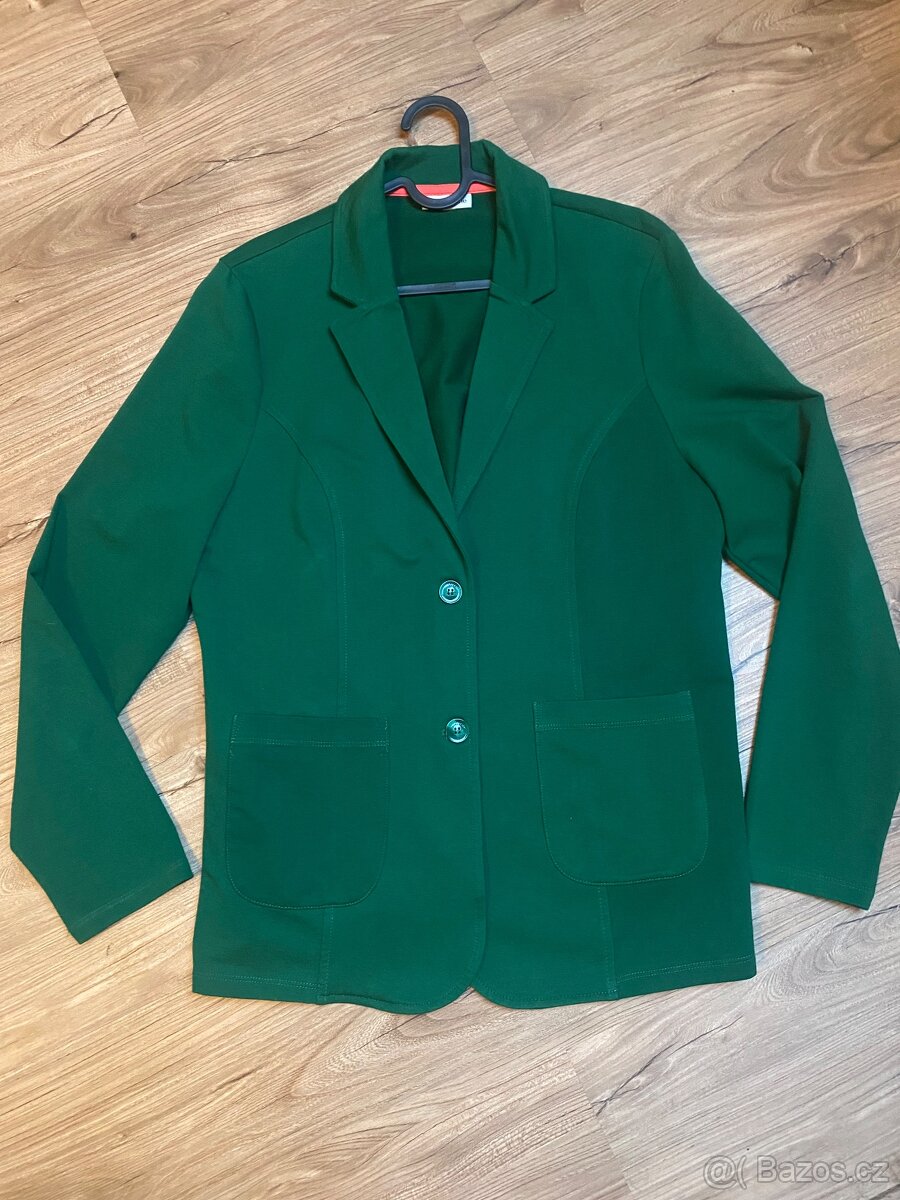 Bavlněné sako s příměsí elastanu, barva tmavě zelená- jehličí. Nové, jen ustřižené visačky a od té doby ve skříni. Vel.42, odpovídá.
