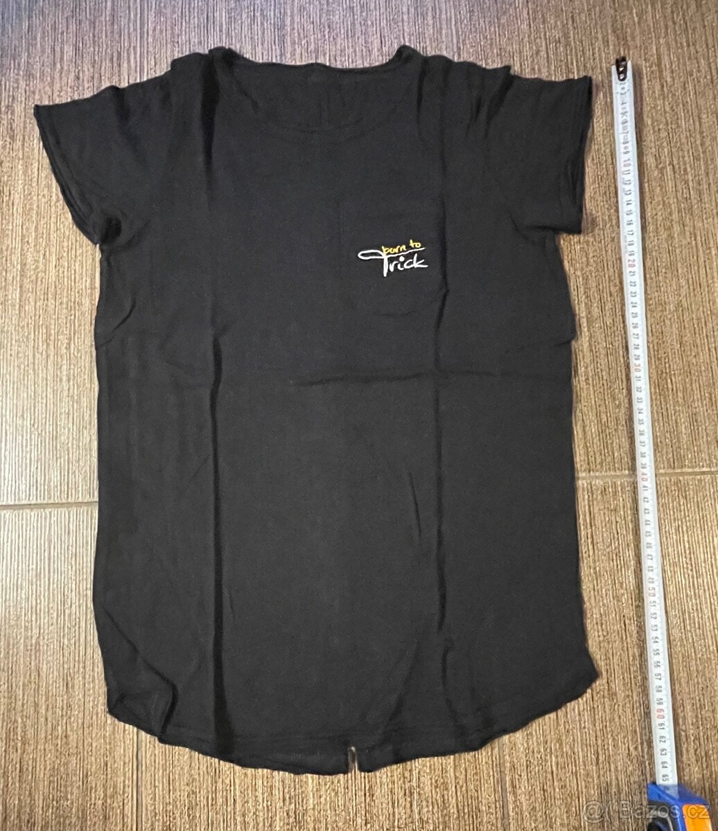 1) černé tričko Born to trick, dole vykrojené, vzadu ozdobný šev středem s menším rozparkem, pružnější materiál, celková dálka 62 cm