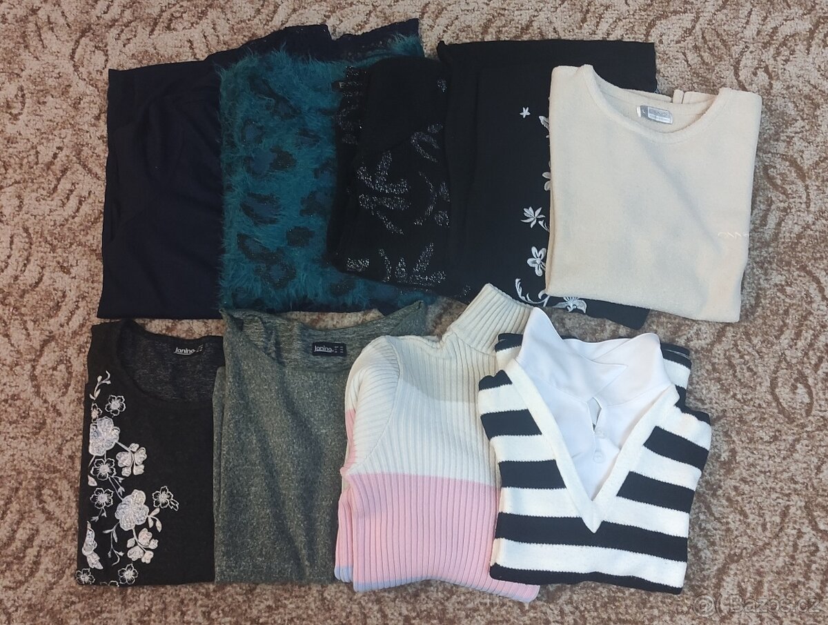 6. černý tenký svetřík vel.42, délka od ramene dolů 64cm, šířka od podpaží k podpaží 54cm, délka rukávu od podpaží 47cm;