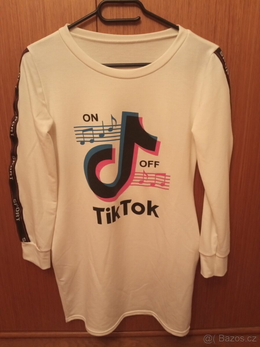 Prodám dlouhé dívčí triko s kapsami a motivem tiktok. Celková délka 70cm, rukávy 50 cm.
