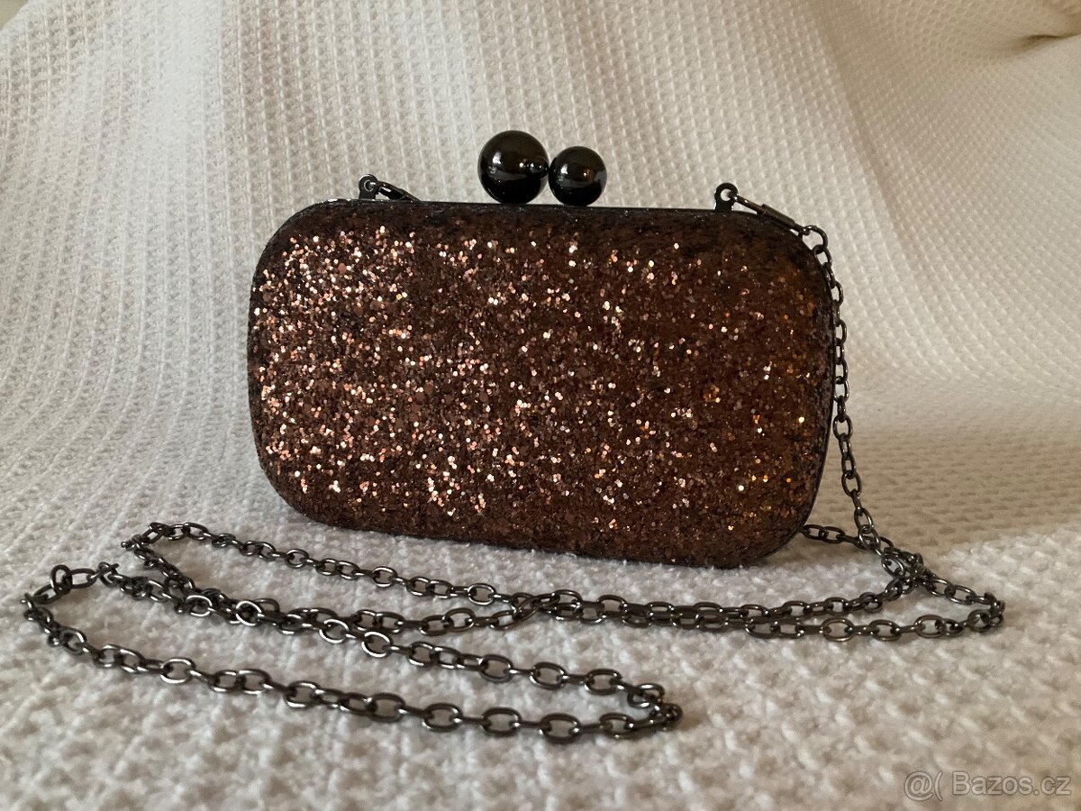 Prodám zcela nové psaníčko, nepoužité. Pěkně třpytivý povrch měděné barvy, pevný tvar, popruh - řetízek. Rozměry: 17 x 11 x 6 cm.