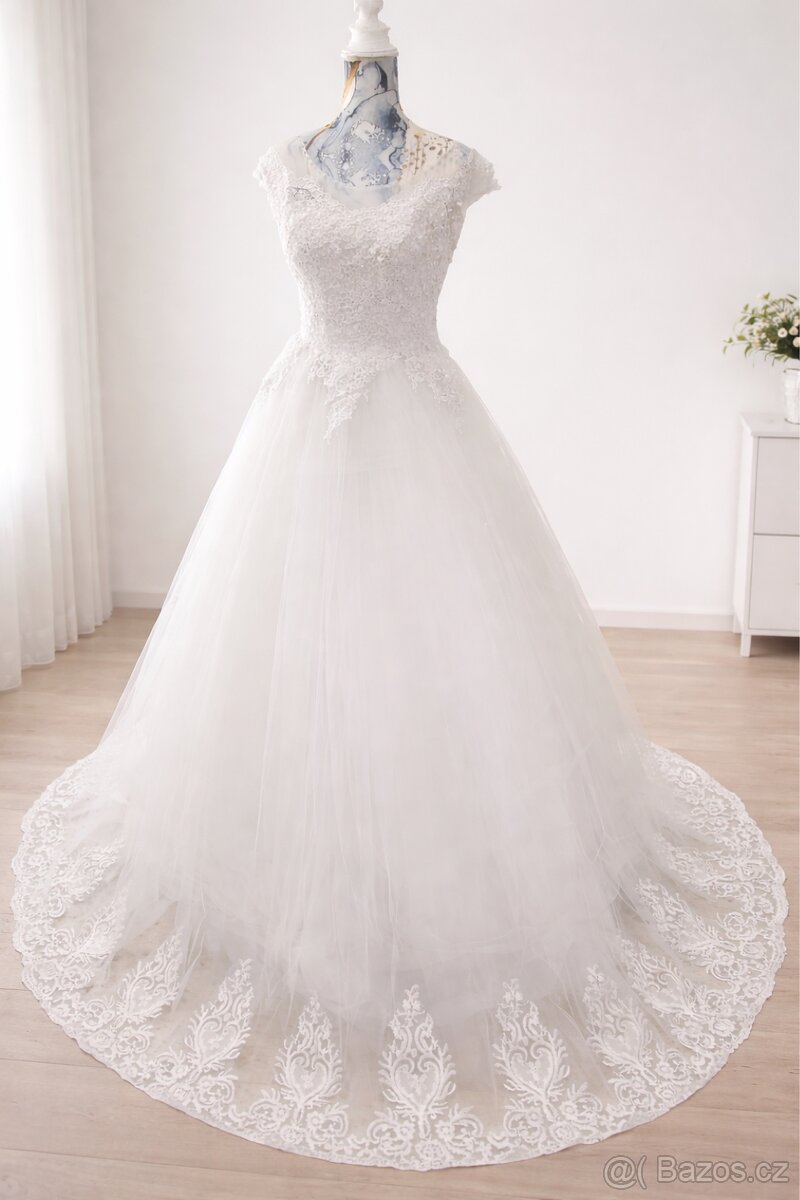 ELEGANTNÍ SVATEBNÍ ŠATY vel.36 - [9.2. 2026]Hladké bílé šaty s širokou sukní na zadní zip.