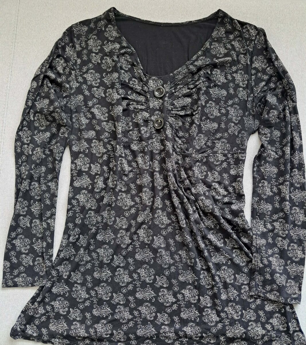 Halenka s krátkým rukávem - [16.2. 2026]Slušivá dámská halenka s ozdobnými knoflíky a falešnými náprsními kapsami. Nošené, ale vady jsem nenašla. Barva je černá, odpovídá sytějším fotografiím bez metru.