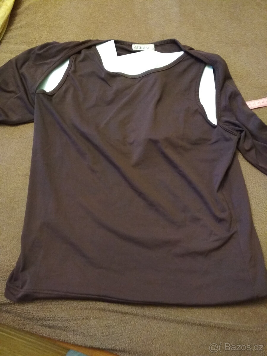 Prodám elegantní dámské tričko Chaloc s prostřihy v ramenou. Na první fotografii s vloženým papírem. Barva je zajímavá tmavofialovo - šedá. Fotografie je mírně zkreslená. Šířka hrudníku 2x40cm