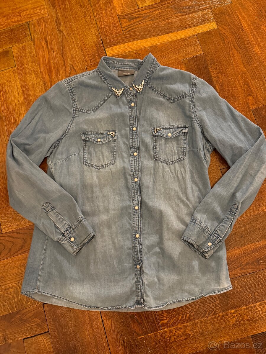 Dobrý den, nabízím dámskou džínovou košili ve velikosti 42. Šířka přes prsa 52 cm, délka 69 cm. Osobní předání v Praze nebo mohu zaslat.