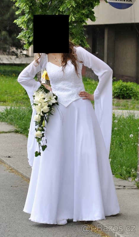 Krásné romantické svatební šaty s vlajícími rukávy. Velikost cca 42 na postavu 175cm vysokou. Šaty jsou rozděleny na sukni a korzet. Sukně má obvod pasu 64cm (zapínání na zips a knoflíček) je dlouhá 114 cm. Korzet má obvod přes prsa 88-94cm je na šněrování. Jsou jednou oblečené v den svatby.Jsou ve výborném stavu. Původní cena 4500 Kč.
