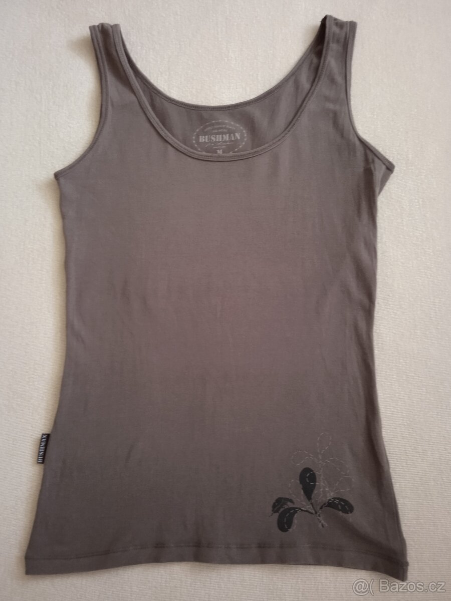 Prodám zánovní dámské tílko BUSHMAN, 97% bavlna, 3% elastan. Velikost M, přední délka od výstřihu 43cm, zadní 50cm. Obvod hrudníku 72cm, pasu 68cm, boků 78cm, průramků 48cm.